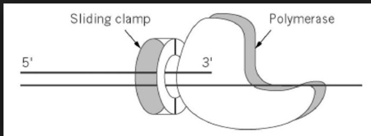 funciton: forms a ‘sliding clamp’ on the DNA as its replicated. prevents the polymerase from dissociating