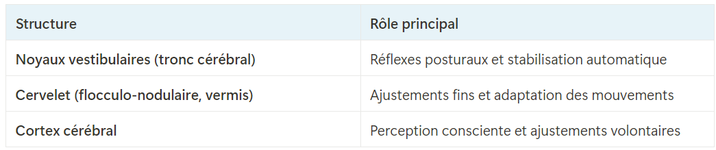 Quel est le rôle du cortex, noyaux vestibulaires et cervelet dans l’équilibre