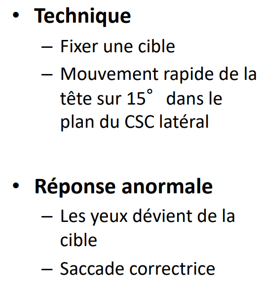 Si le patient ne peut maintenir son regard lors d’un mouvement brusque de la tête vers un côté, cela indique une atteinte vestibulaire périphérique aiguë du même côté => nystagmus + saccade correctrice