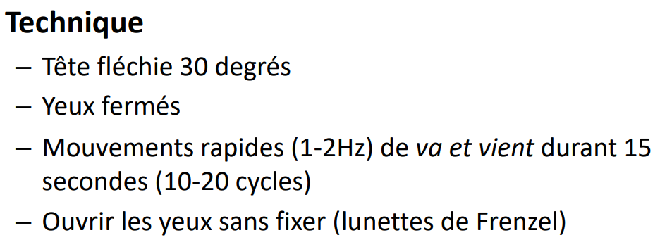Manœuvre de Dix-Hallpike => permet de provoquer le nystagmus caractéristique et de confirmer le diagnostic.