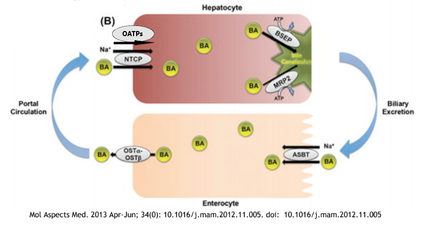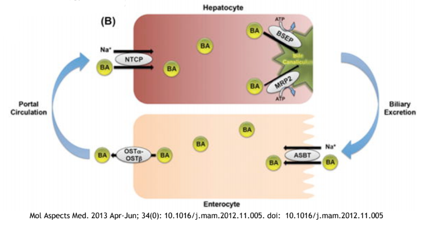 Apical sodium dependent bile acid transporter (ASBT) – from the intestinal lumen into the enterocytes.