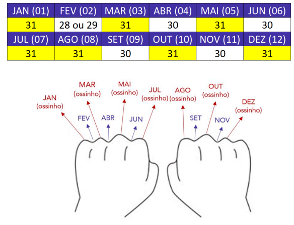 Ou seja, quando bater nos “ossinhos” será os meses que terão 31 dias.