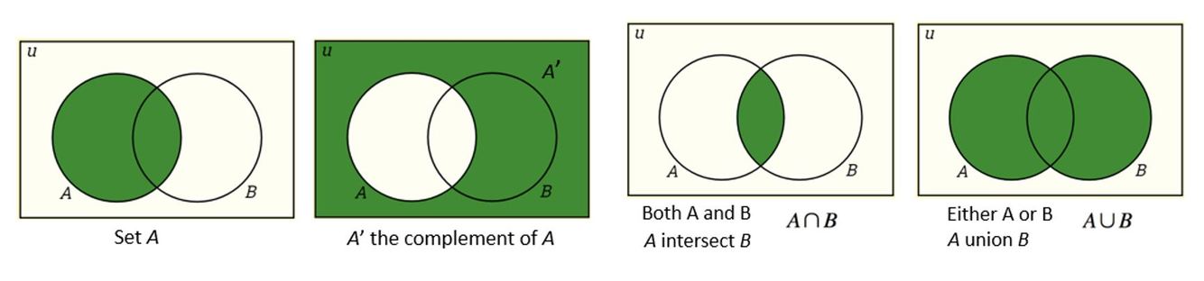 How are A, A’, A∩B, A∪B represented on a Venn diagram?