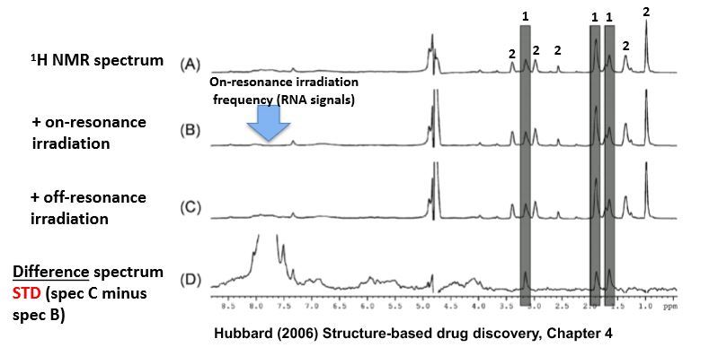 Take the difference between spectra of before and after irradiation + saturation: Peaks that disappear are unaffected and don’t bind (ligand 2) peaks that show a difference became saturated (ligand 1)