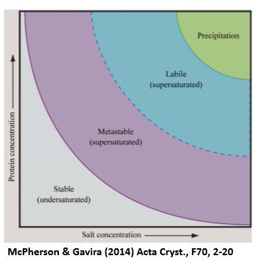 Dilute drop of protein dissolved in volatile component (H2O) in a resevoir with a concentrated “mother liquor” containing precipitant. Eventually the volatile component will evaporate to equilibriate both solutions, leading to an increase of protein concentration in the drop, until nucleation occurs. As the protein grows, its concnetration in the drop will slowly decrease until the ‘saturation boundary’