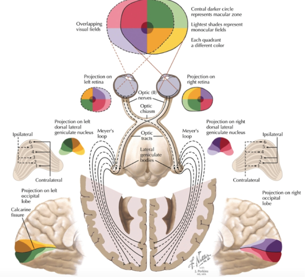 Fra corpus geniculatum laterale projiceres radiatio optica. Fibre fra nedre retina løber primært i Meyers loop gennem temporallappen. Fibre i pars horisontale fører fibre fra øvre retina.