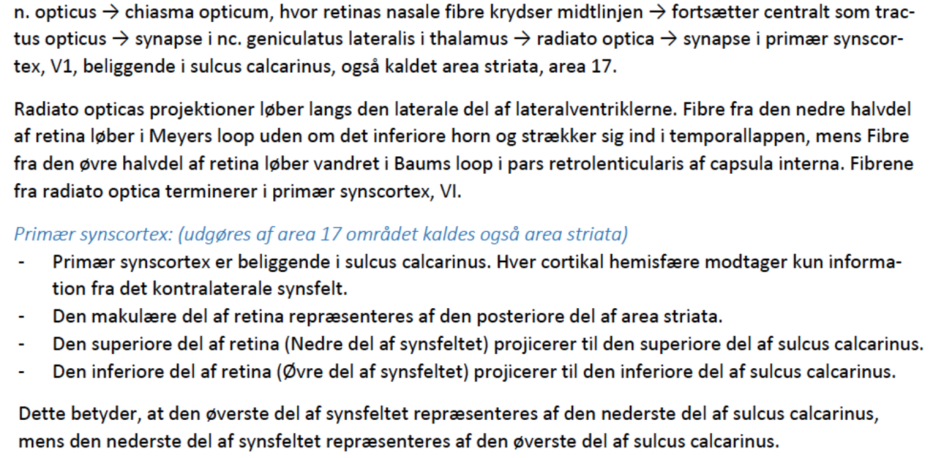Fibrene i retina forlader øjet som n. opticus der løber til chiasma opticum, hvor fibrene fra den nasale re-tina krydser midtlinjen. Efter krydsningen fortsætter fibrene centralt som tractus opticus, hvor fibrene fra venstre synsfelt løber i højre tractus mens fibrene fra høje synsfelt løber i venstre bane. Dette er bevirket af, at det kun er de fibre fra nasal retina der er krydset i chiasma. Fibrene danner synapse i corpus genicula-tus lateralis i thalamus, hvorefter fibrene løber i radiato optica for til sidst at danne synapse i primær synscortex, V1 (area striata), beliggende i sulcus calcarinus. Area 17.