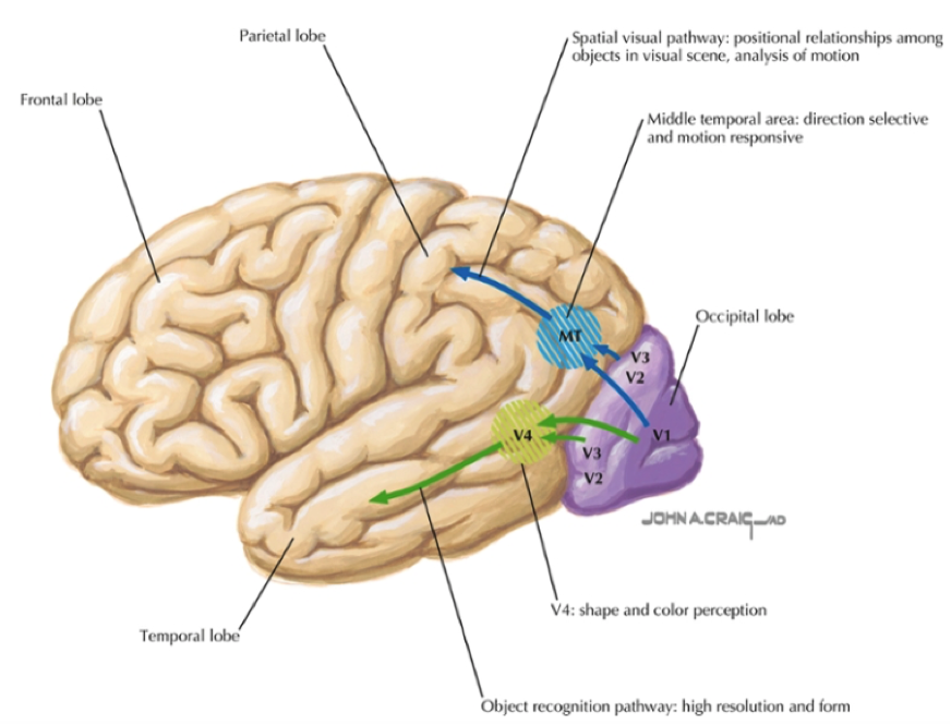 Overgang mellem parietalcortex og occipitalcortex, kaldet MT eller V5, (Middle temporal area?) er særlig vigtig for at identificere bevægelse. Skader giver akinetopsi. Det gør at man ikke kan angive farve og form på genstande der bevæger sig. Står de stille, så kan man godt.