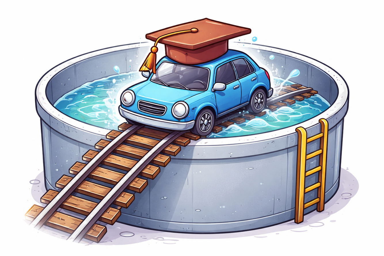 74 car, college cap - wisdom, cistern-sister, rail road track-relative