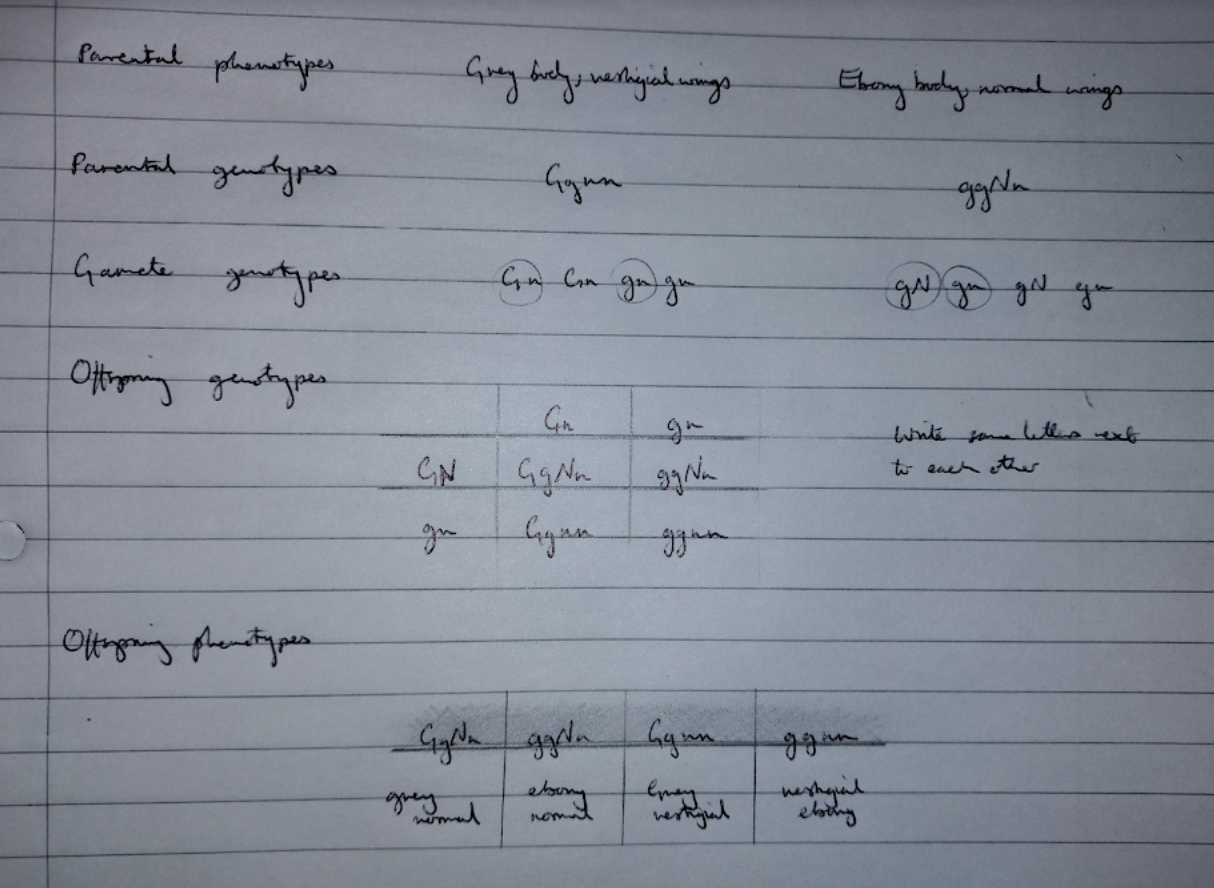 In fruit flies, the allele for a grey body, G, is dominant to the allele for an ebony body, g, and the allele for normal wings, N is dominant to the allele for vestigial wings, n. Vestigial winged flies, heterozygous for body colour, were crossed with ebony bodied flies heterozygous for normal wings.