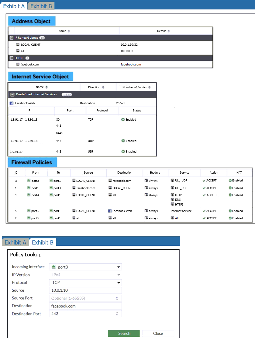 The exhibits show the firewall policies and the objects used in the firewall policies.