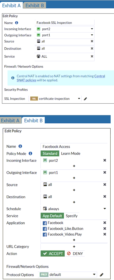 The exhibits show the SSL and authentication policy (Exhibit A) and the security policy (Exhibit B) for Facebook.