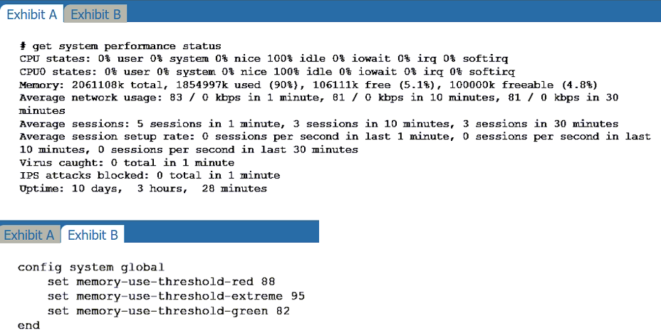 Exhibit A shows system performance output. Exhibit B shows a FortiGate configured with the default configuration of high memory usage thresholds.