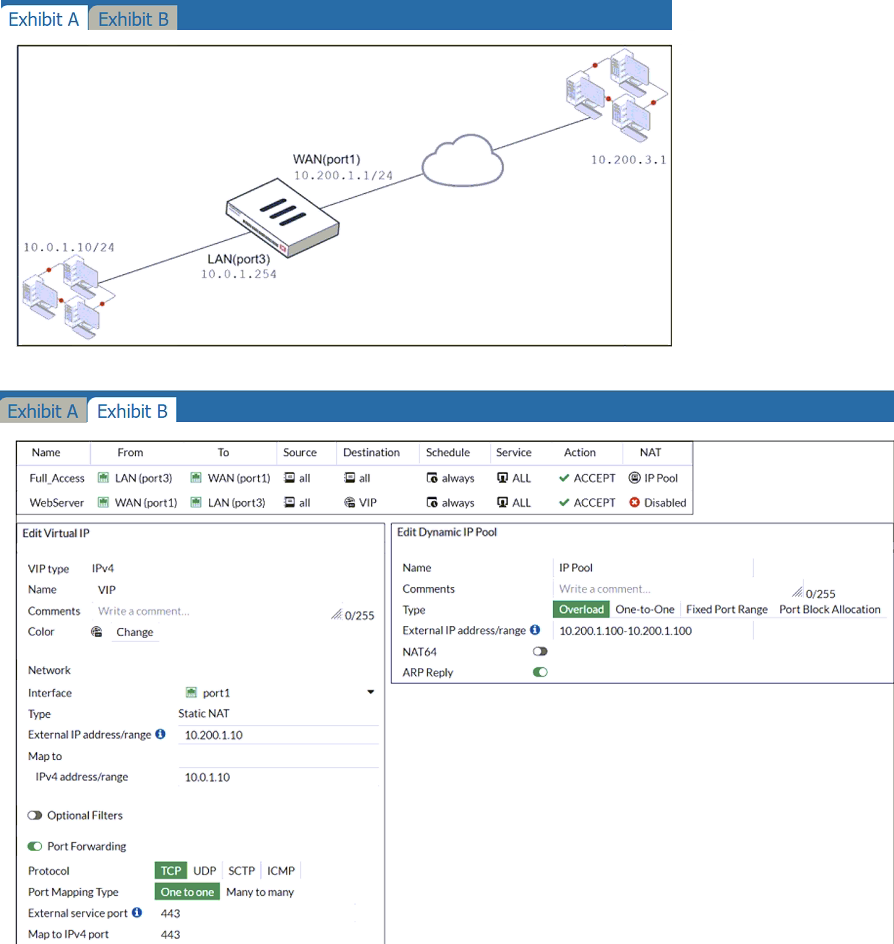 The exhibits contain a network diagram, and virtual IP, IP pool, and firewall policies configuration information.