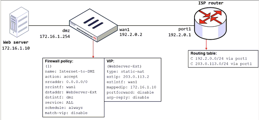 When the administrator tries to access the web server public address (203.0.113.2) from the internet, the connection times out. At the same time, the administrator runs a sniffer on FortiGate to capture incoming web traffic to the server and does not see any output.