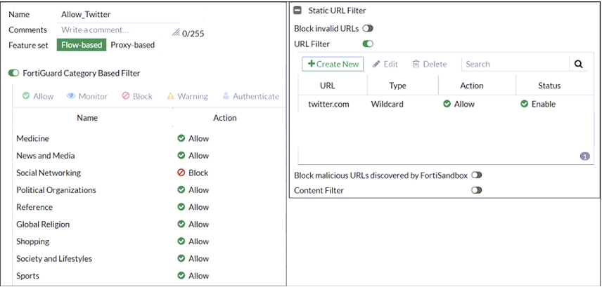 An administrator configured the web filtering profile shown in the exhibit to block access to all social networking sites except Twitter. However, when users try to access twitter.com, they are redirected to a FortiGuard web filtering block page.