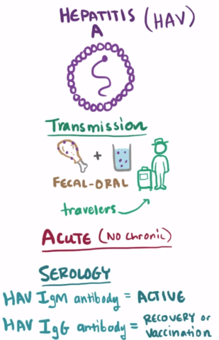 Hepatitis A is spread via the feces, bile, and sera of infected individuals and is usually transmitted via the fecal-oral route, but can also be transmitted via infected blood.
