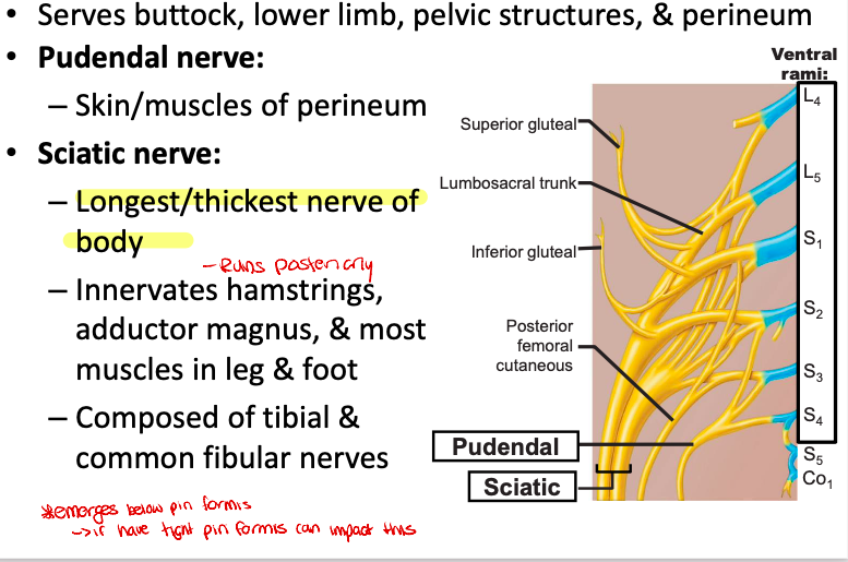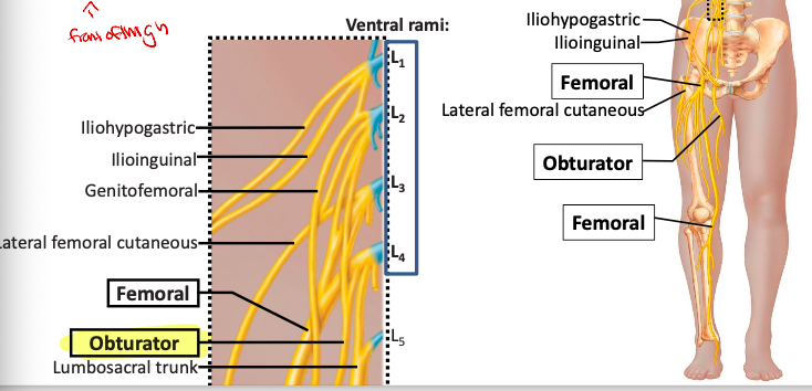 femorla nerve: innervates anterior thigh muscles of skin of anteiror/medial tigh and medial leg (goes in front)