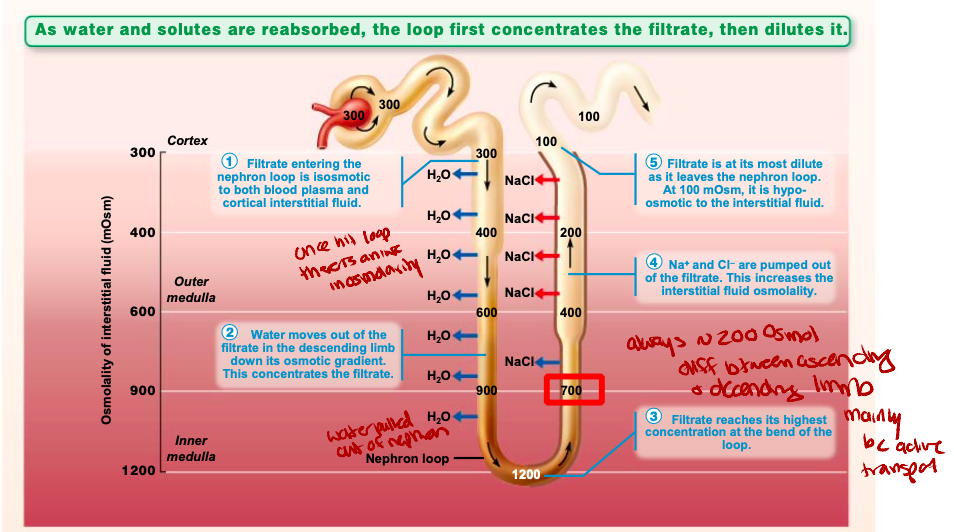 *H2) passes out filtrate causes remaining filtrate osmolarity to increase to 1200mOsm