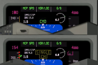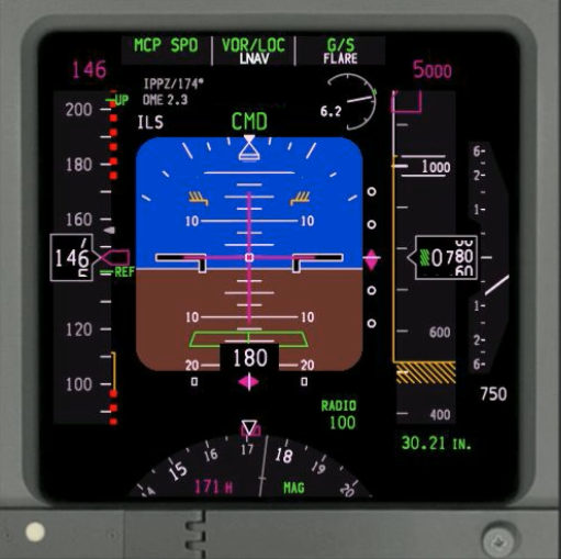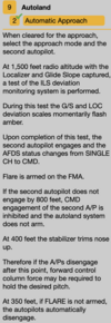 FLARE armed (white) - during a dual A/P approach, FLARE is displayed after LOC and G/S capture and below 1500 ft RA. The second A/P couples with the flight controls and A/P go around mode arms.