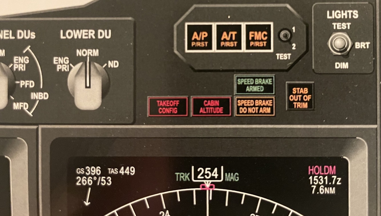TO/GA, VNAV SPD, VNAV PTH, V/S, ALT ACQ, ALT HOLD, MCP SPD, G/S (white and green), FLARE (white), FLARE (green), G/P (white and green)