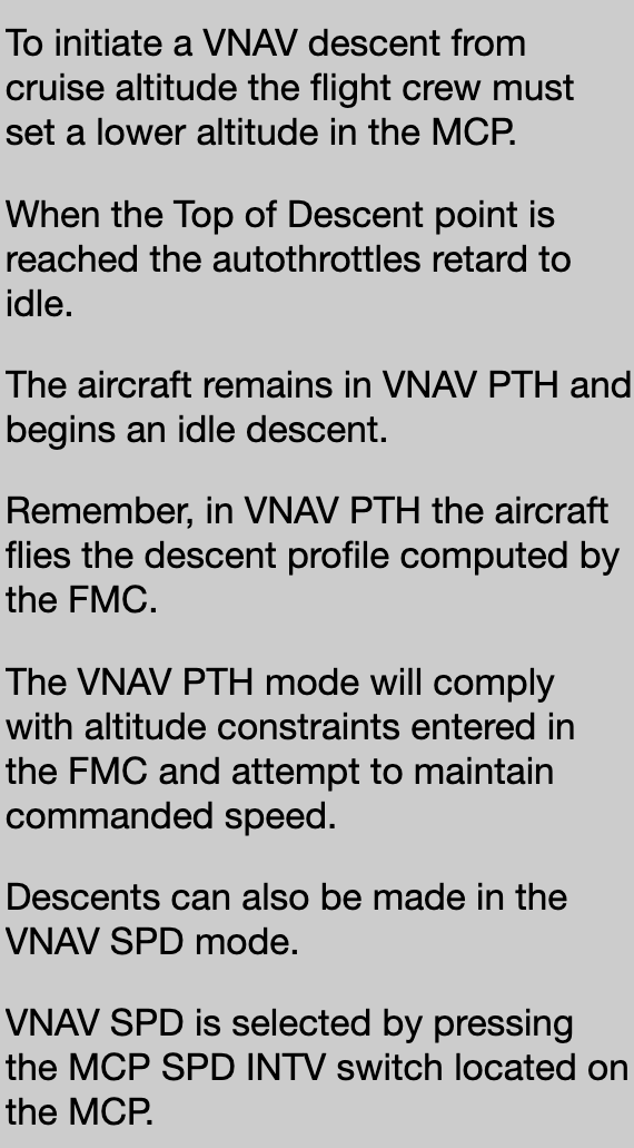 ** When VNAV is pressed the mode will initially go into VNAV SPEED and then change to VNAV PATH once the FMC cruise altitude is reached. **
