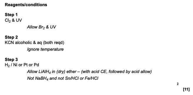 reagents and conditions for each step, but equations and mechanisms are not required (6)