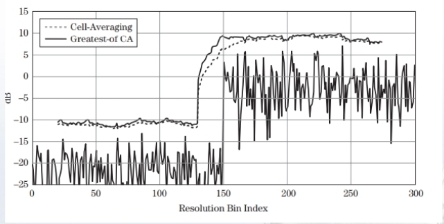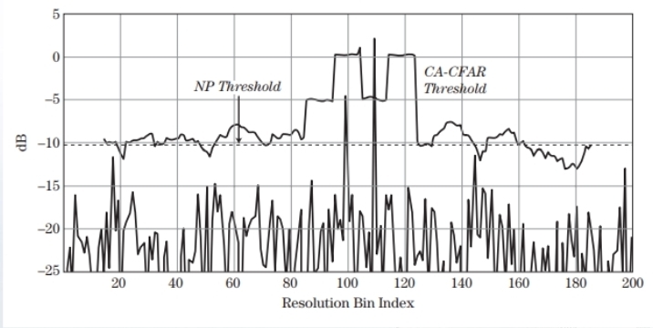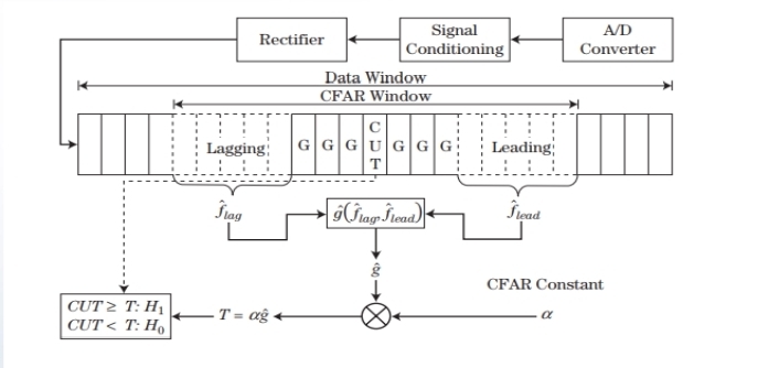 Each bearing is split into range bins. For each CUT (Cell Under Test), the average power of a number of leading and lagging cells on either side of the CUT are averaged and compared to the CUT to determine a unique Detection Threshold. There are G (Guard) cellls on either side of the CUT so that a large target which takes up many cells does not overlap with the Leading and Lagging windows.