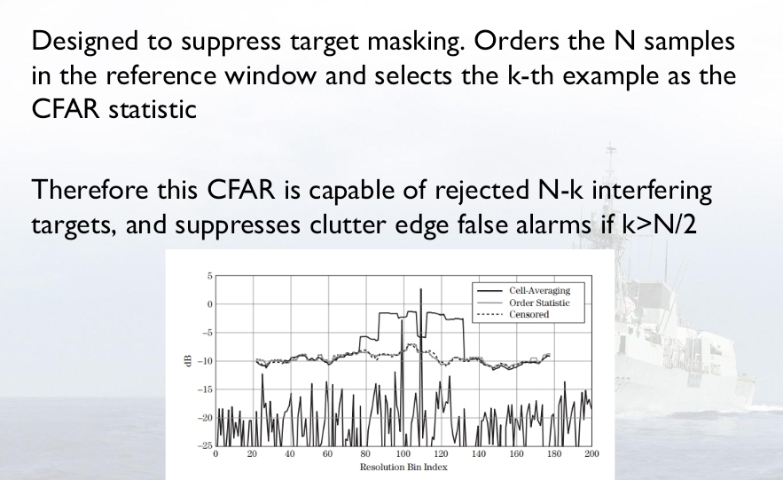 Rejects N-k interfering targets and suppresses clutter edge false alarms if k>N/2.