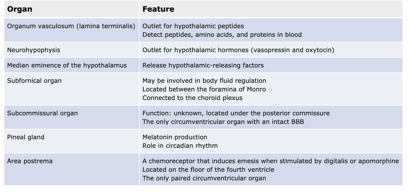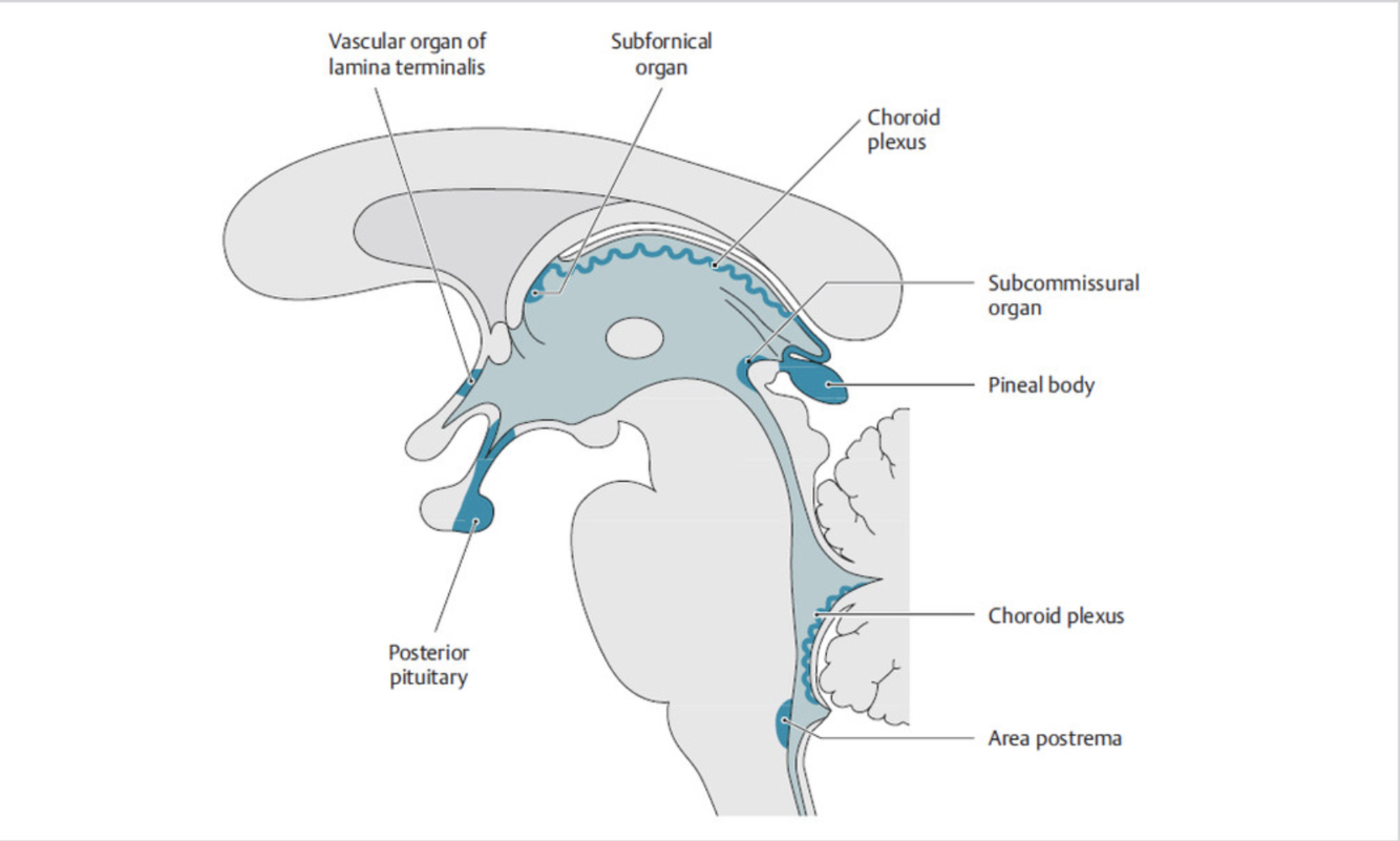 midline ventricular system structures of specialized tissues with absent BBB due to fenestrated capillaries