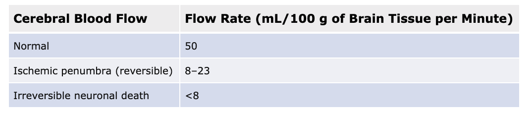 What is the normal/ischemic/irreversible death Cerebral blood flow rate?