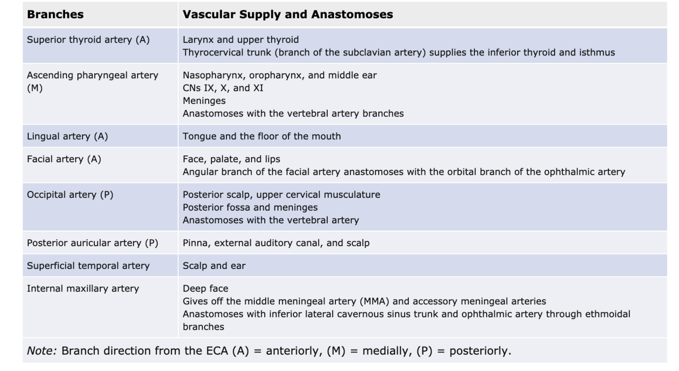 What are the ECA branches and what does it supply and anastomose with ?