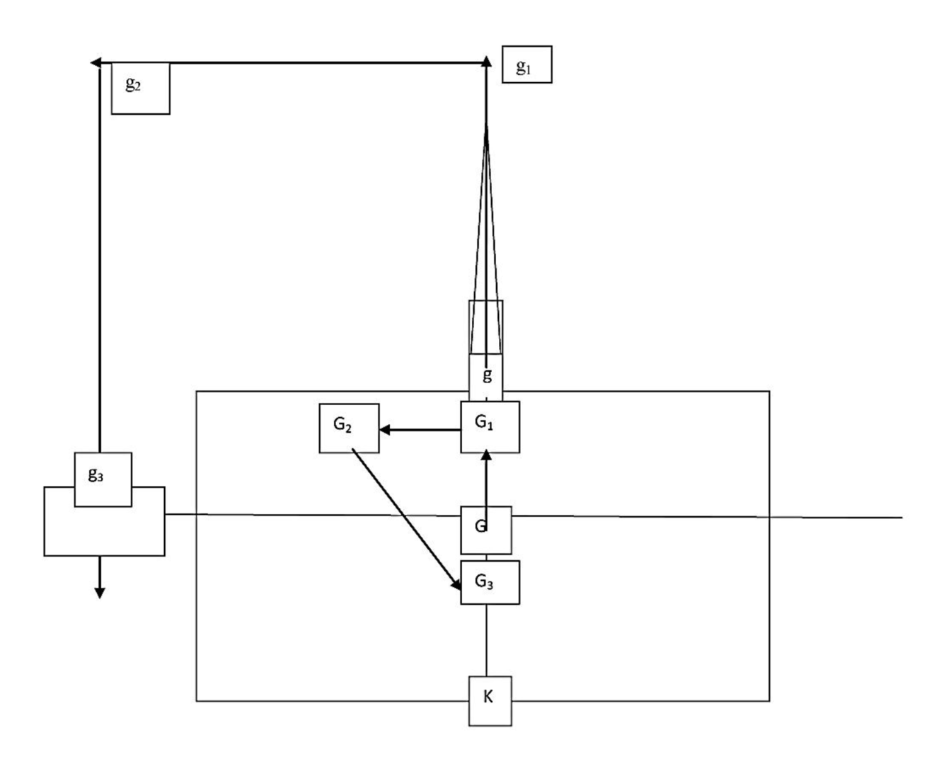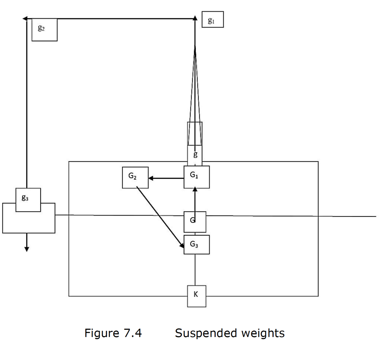 gravity (g) of the weight moves to the head of the crane or derrick (g1).
