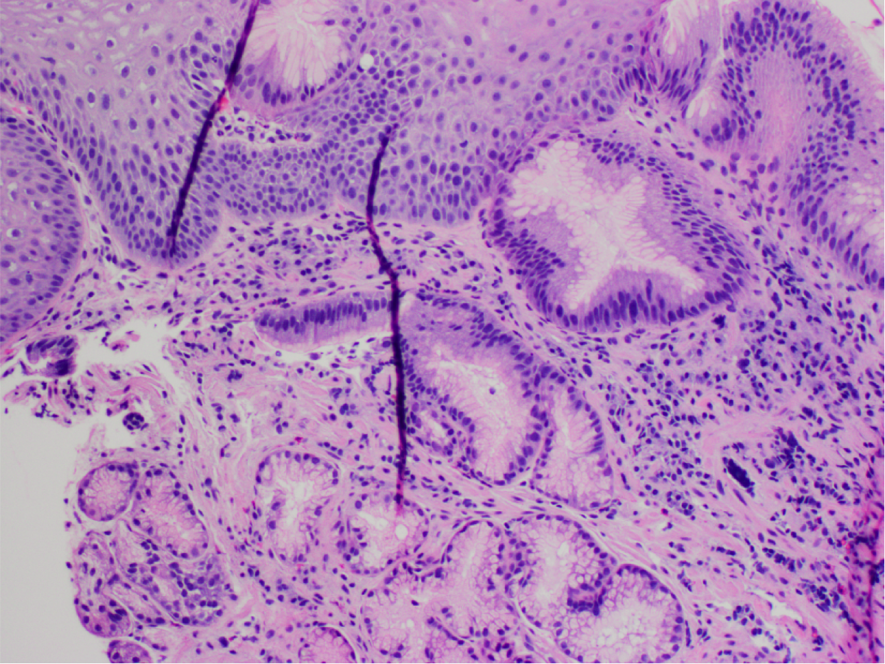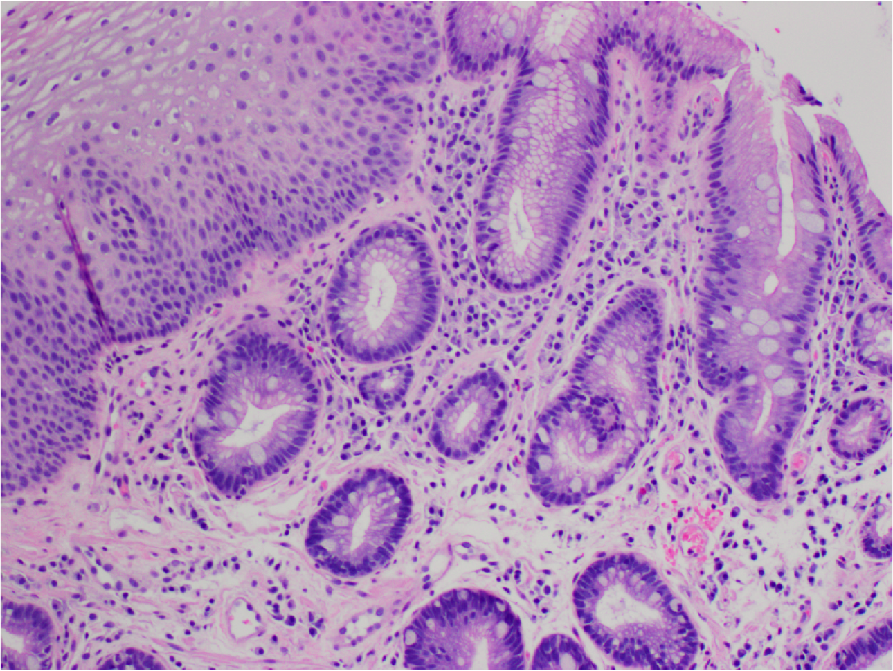 Gastro-esophageal junction with columnar mucosa of intestinal type (intestinal metaplasia).