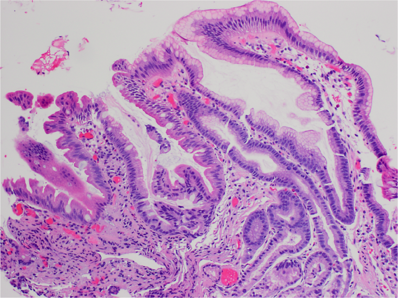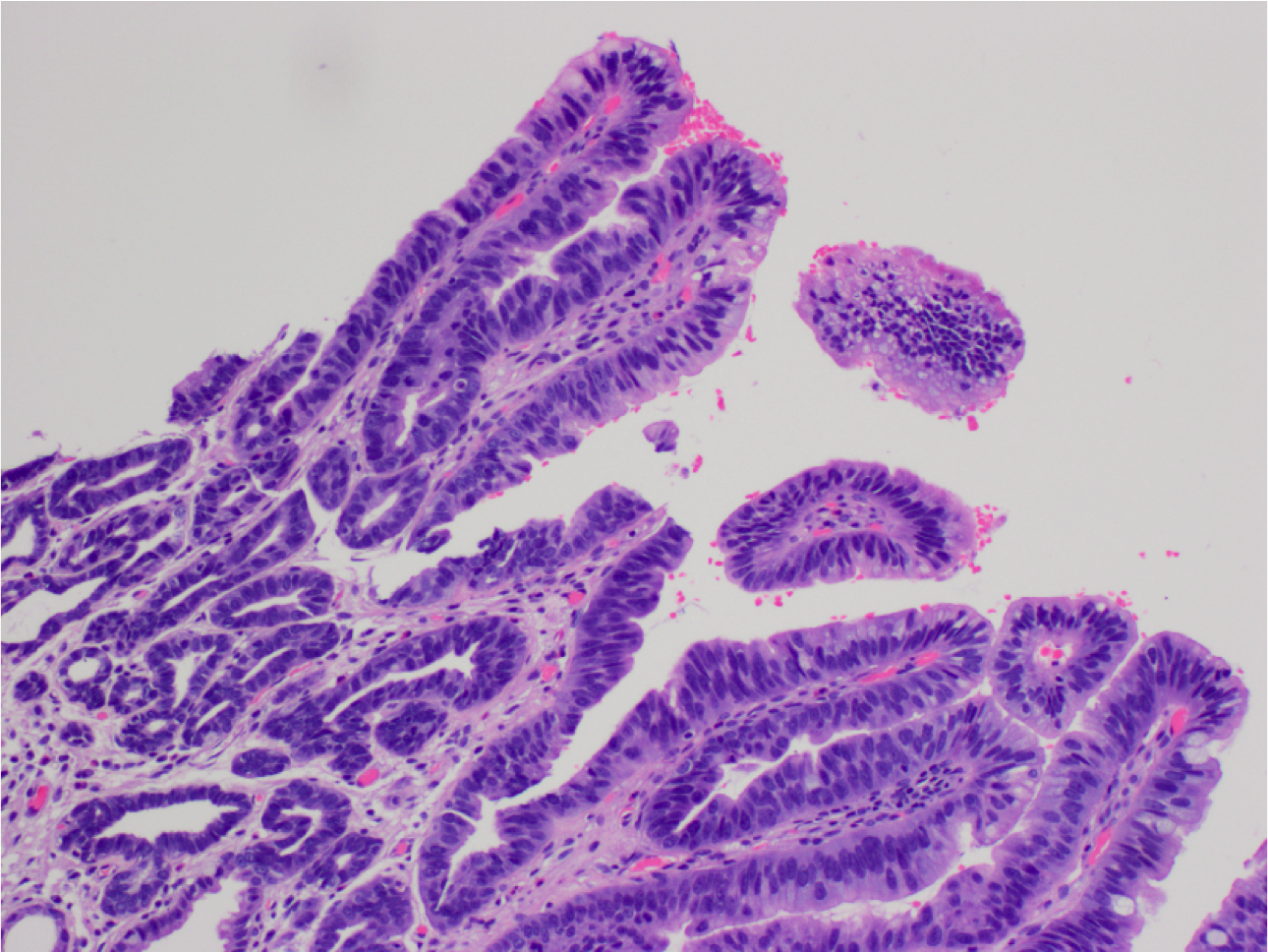 Gastric metaplasia of the superficial epithelium (top and right, note gastric-type mucin in the cells). Compare to the intestinal epithelium with goblet cells on the left.