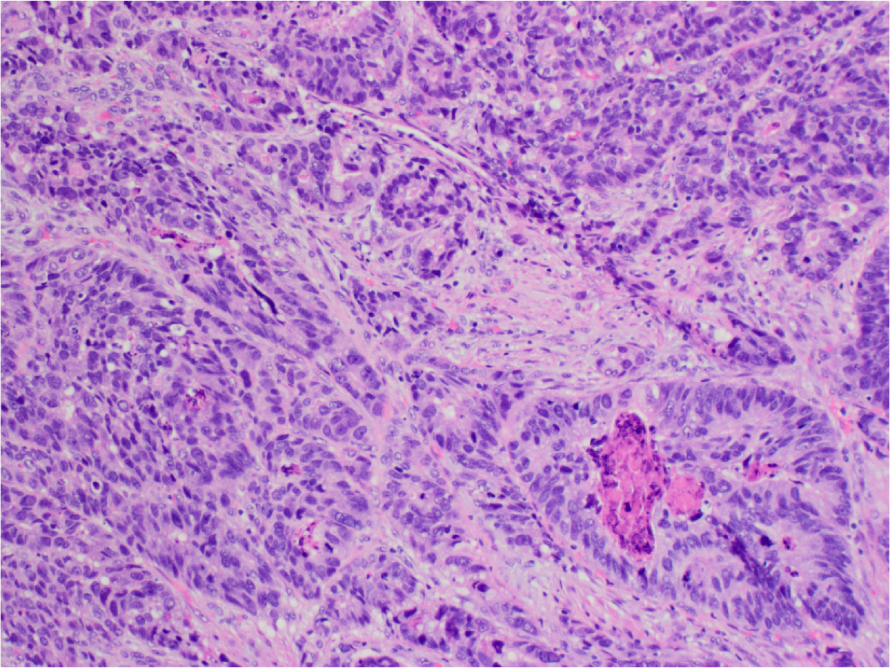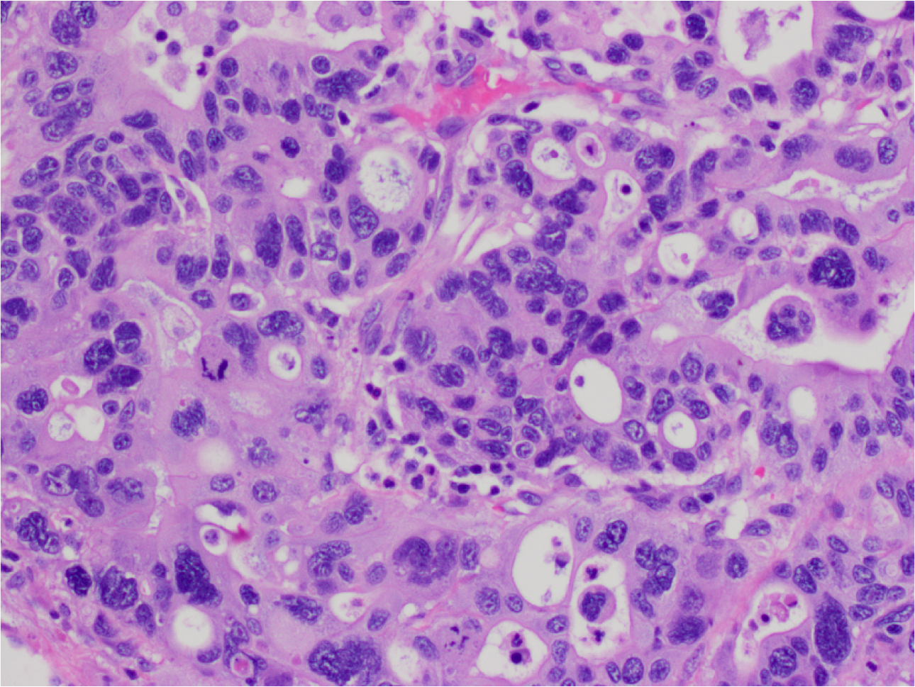 High power view of malignant glands. Note irregular shape and complexity of the glands with abortive lumina, necrotic debri, nuclear enlargement and mild nuclear pleiomorphism