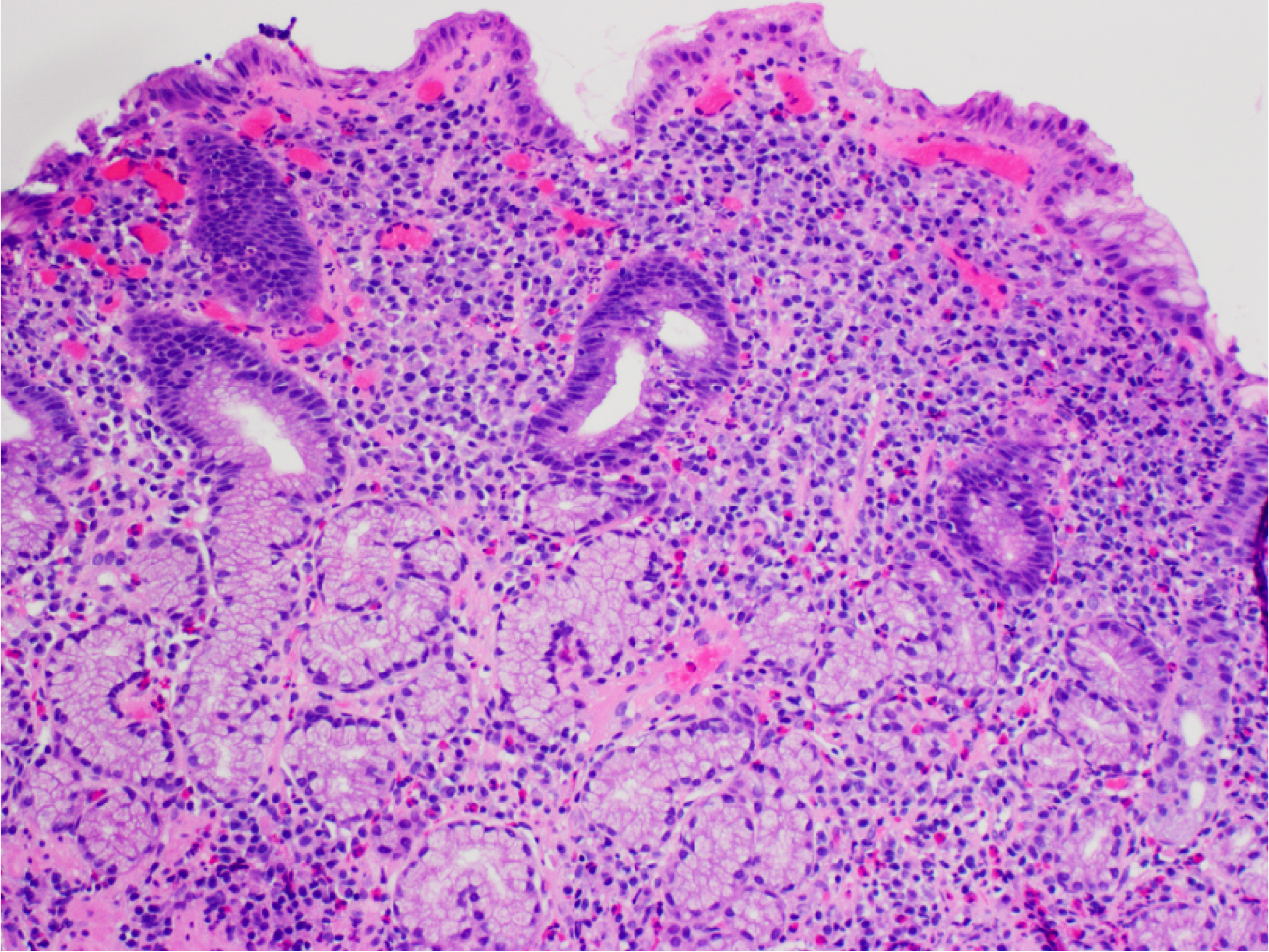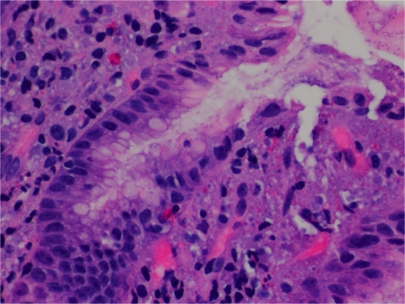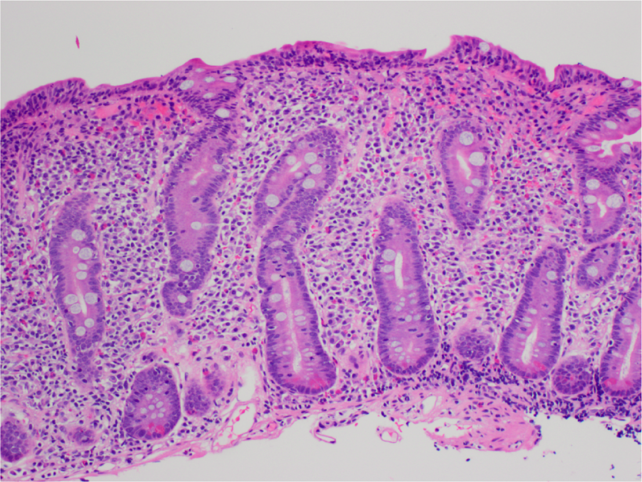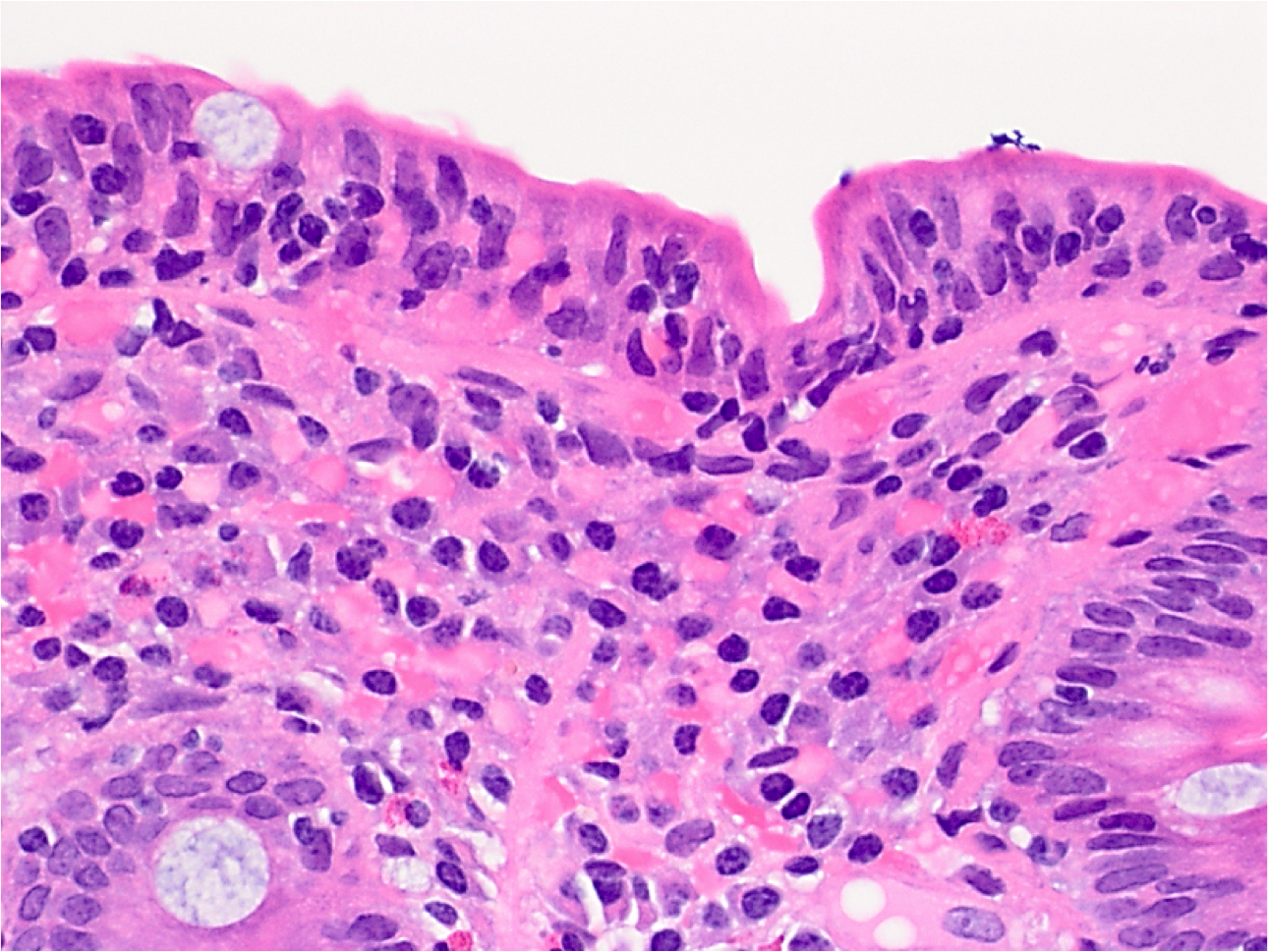 Increased intraepithelial lymphocytes (more than 20 per 100 epithelial cells, usually no need to count) in the superficial epithelium partially overlapping with the nuclei of the epithelial cells. Lymphocytic nuclei have dark-blue chromatin and are more round.