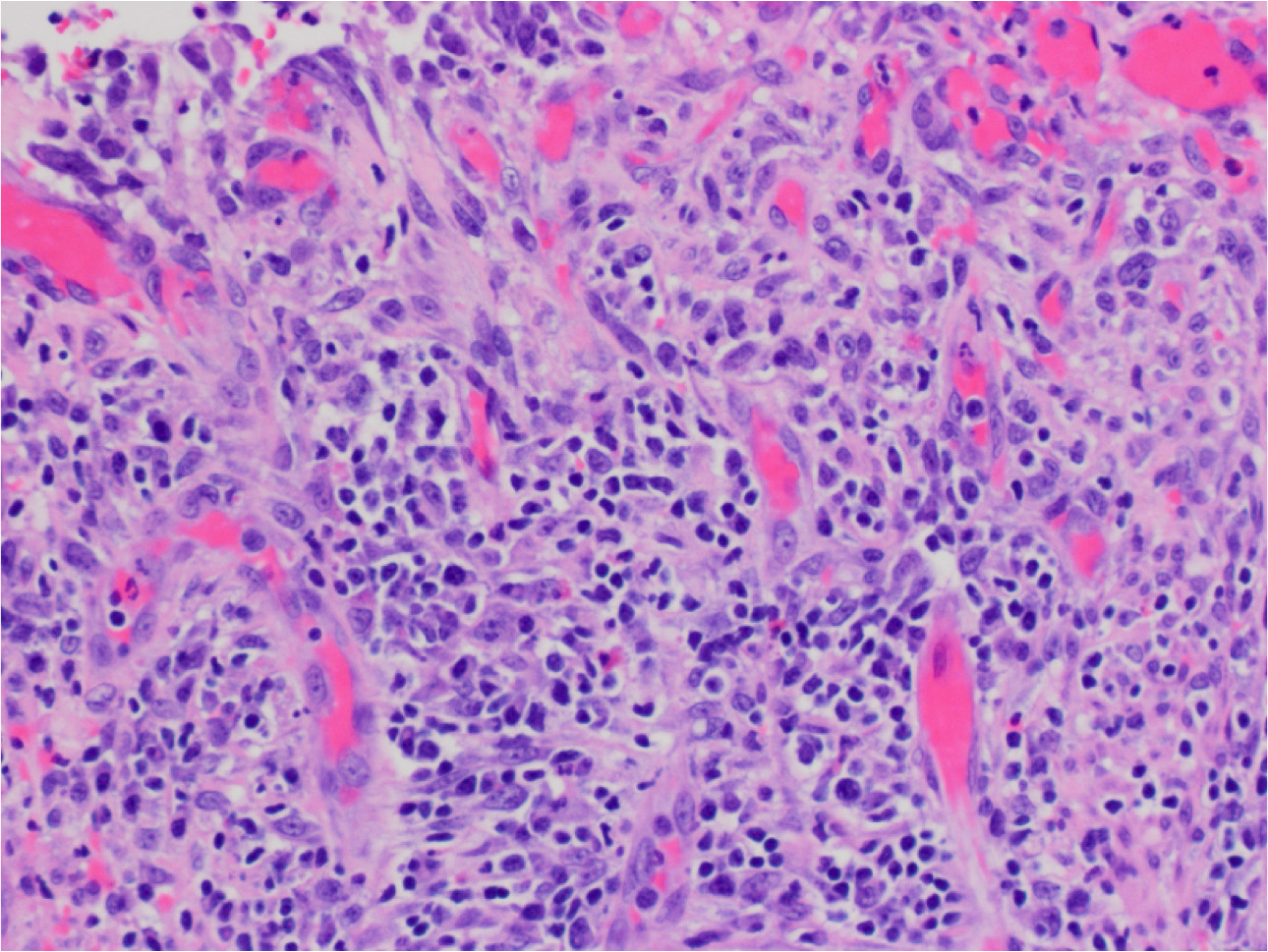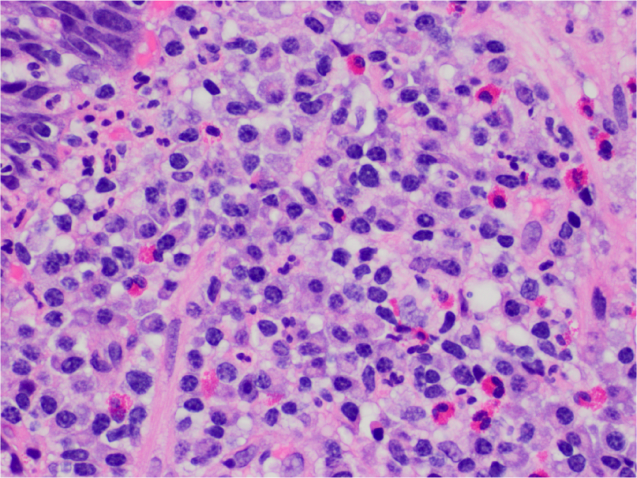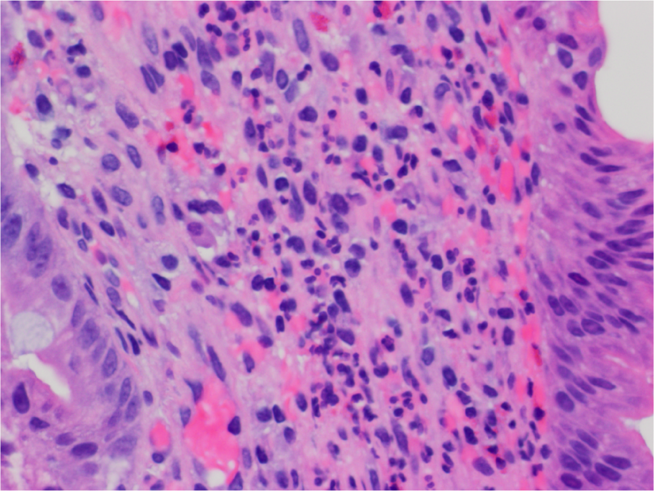 High power view showing lymphocytes, plasma cells and admixture of eosinophils. Presence of neutrophils (small segmented nuclei in the upper left) indicates active inflammation which is very characteristic of H pylori infection.