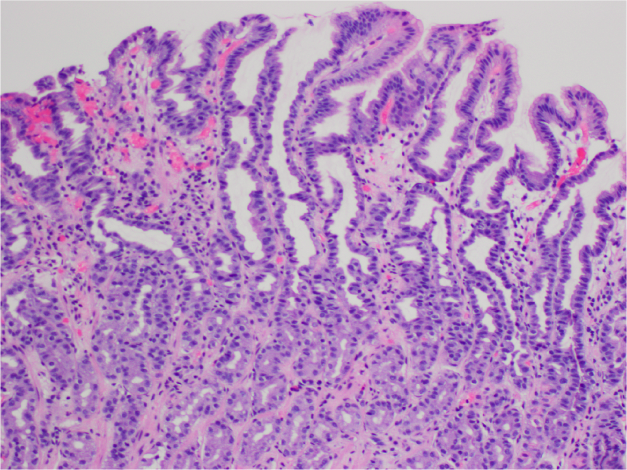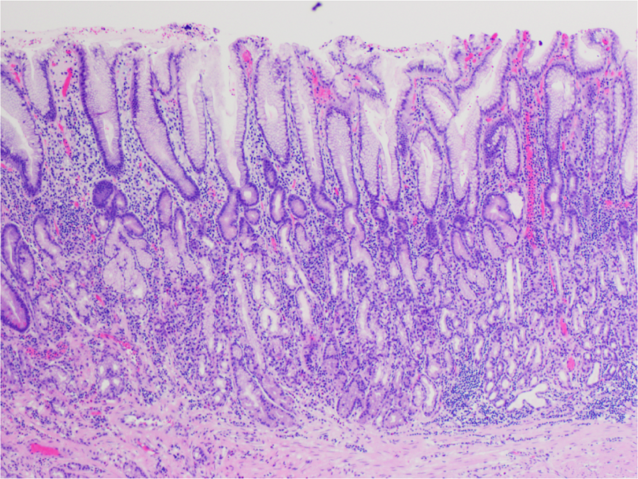 Dense mononuclear cell infiltrate consisting of plasma cells and lymphocytes is seen in the lamina propria of the antral mucosa.