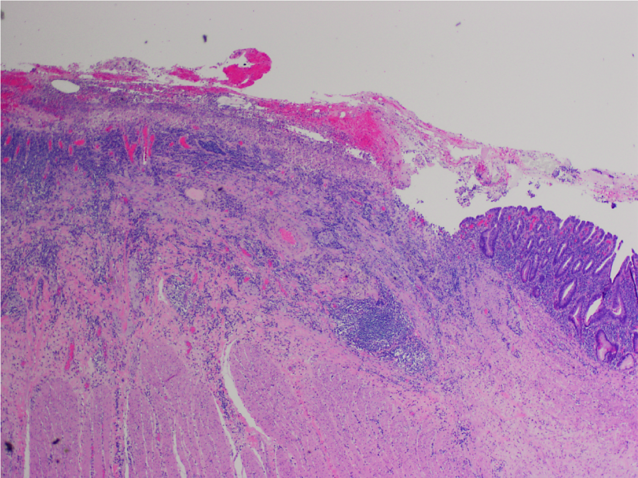 Mucosal denudation (left) with fibrinopurilent exudate (top), necrosis, and underlying granulation tissue.