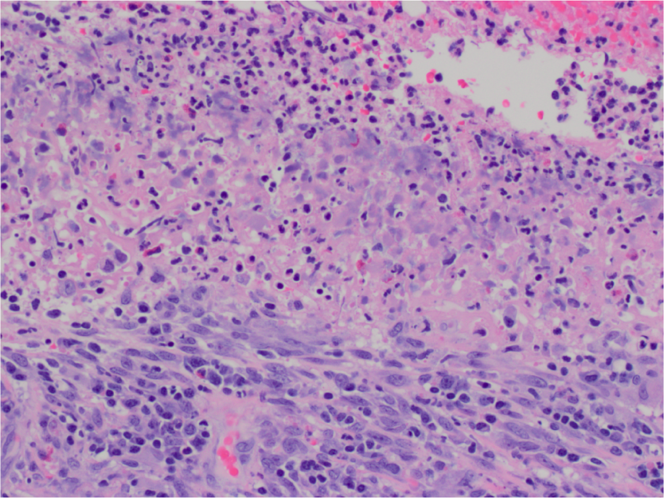 High power view of fibrinopurilent exudate (top), necrosis (middle) and superficial layers of granulation tissue (bottom).