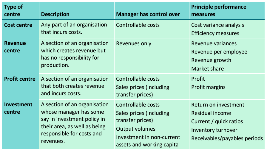 For each type of centre/department within an organisation, give a brief description, what a manager of that division has control of with regards to the company, and the principle performance measures that can be used to appraise them