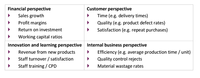 Outline how a balance scorecard is displayed and include some key performance indication examples