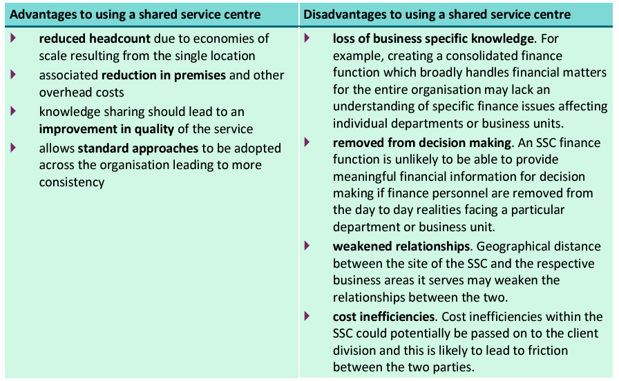 What are the advantages (4) and disadvantages (4) of using a shared service centre?