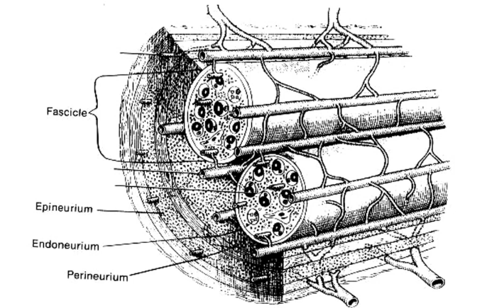 Axons coated with endoneurium, grouped into fascaicles (nerve bundles), covered with perineuriu, grouped to form nerve covered with epineurium