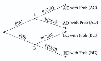 A tree diagram shows the probabilities of two events and the conditional probabilities of two subsequent events.