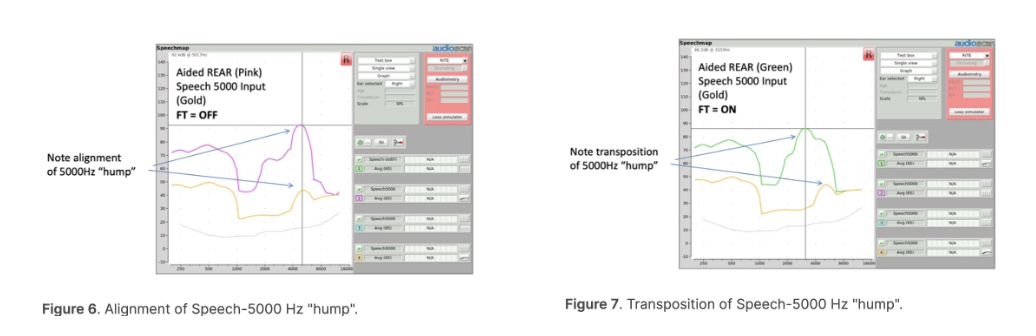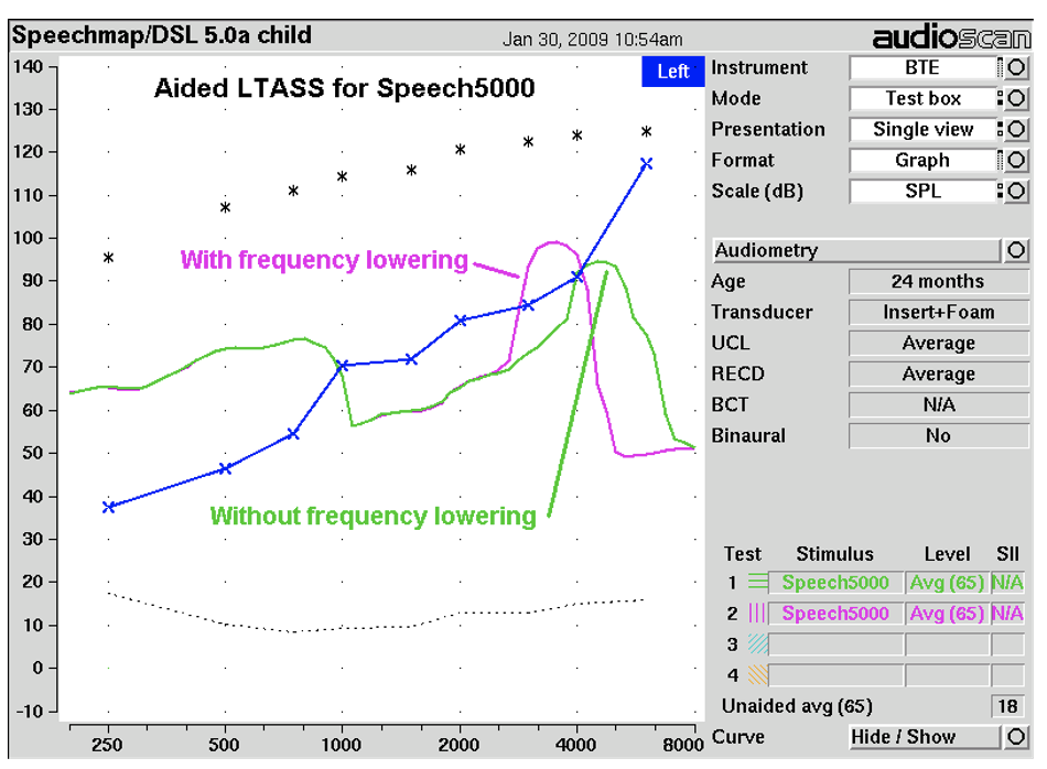 1) Conduct speech mapping as per standard guidelines with no active frequency lowering, with a full spectrum reference (speech), with patient thresholds present