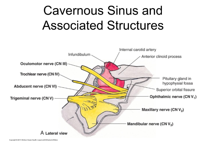 The cranial nerves CN III, CN IV, CN V1 (ophthalmic), CN V2 (maxillary), CN VI.