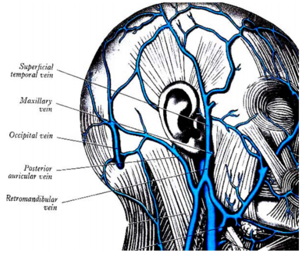 Lymph from the skull -> jugulofacial venous return -> jugulosublcavian venous return -> right lymphatic duct OR left thoracic duct -> venous return.
