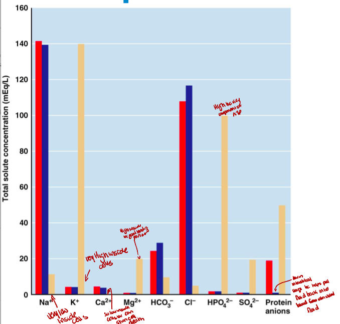 describe composiiton of Ca, Mg and, HCO3, and Cl in blood plasma, interstitial fluid, intracellular